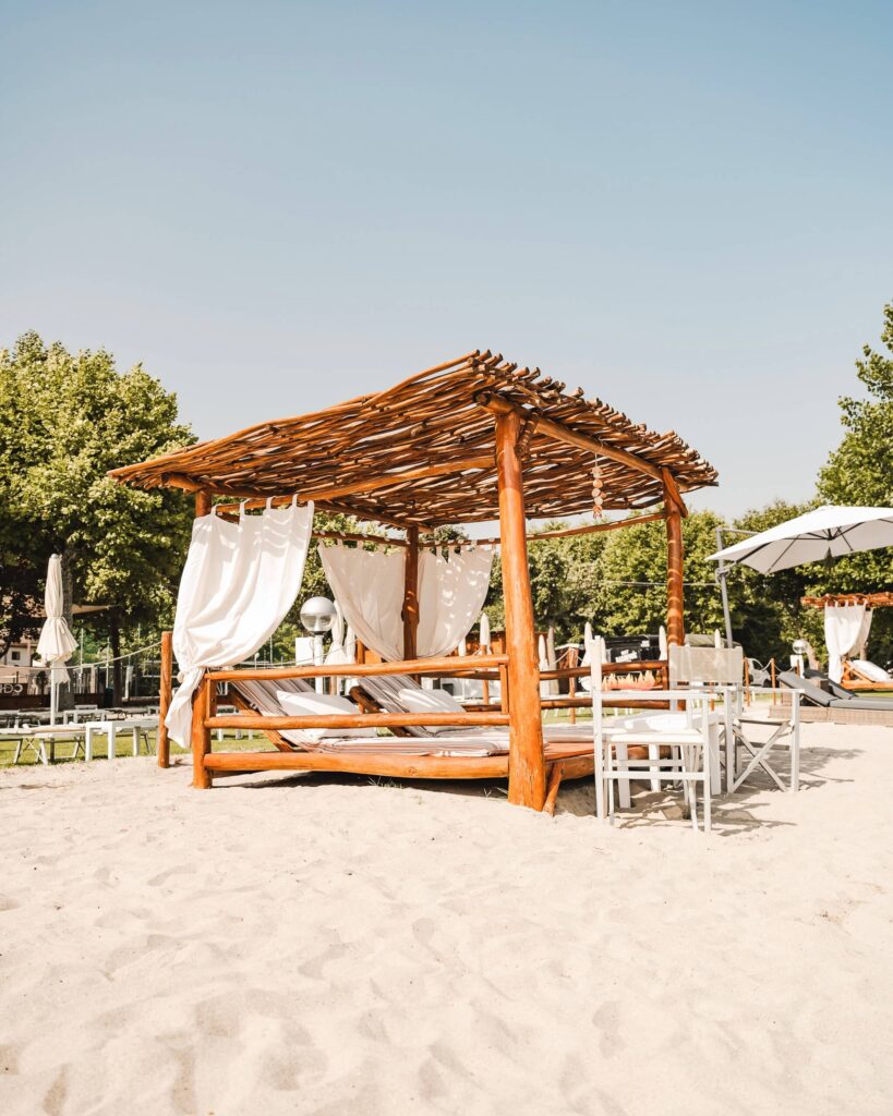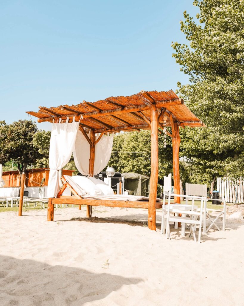 Gazebo con materasso imbottito e cuscino poggiatesta per 2 persone sulla spiaggia fronte lago.